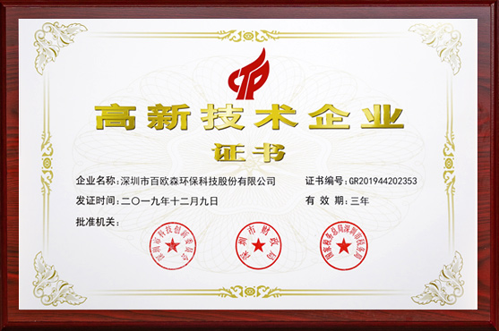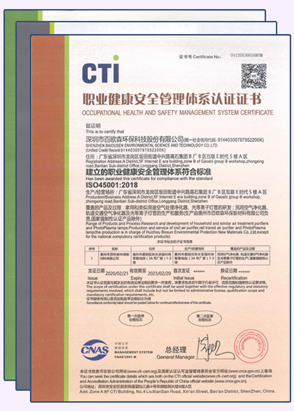 百歐森為“國家高新技術企業”與“國家守合同重信用企業”;國家標準制定者之一;全球唯一獲得“IRIS認證(TS22163)”的空氣凈化企業。深圳知名品牌;被廣東省科學技術廳授予《廣東省空氣智能監測與凈化工程技術研究中心》,具有消毒產品生產企業衛生許可證、環保工程專業承包資質、中國環保產品認證,中國節能產品認證、3C認證、CQC認證等資質,目前擁有國家專利100余項,數百項專利持續申報中。