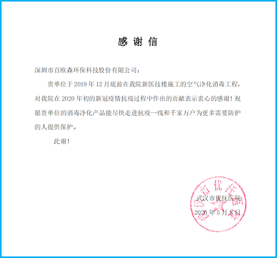 武漢優撫醫院整體中央空調系統及衛生間在2019年底安裝了百歐森的全面空氣凈化消毒系統,此次疫情中百歐森殺菌消毒系統為病人和醫護人員帶來多一份的保護。