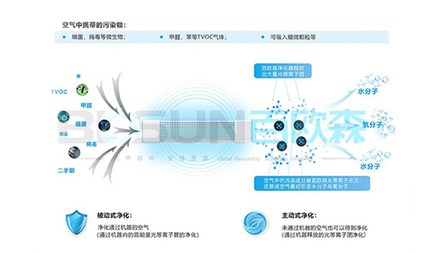 不造成二次污染:百歐森光等離子技術(shù)把空氣中各種污染物的化學(xué)結(jié)構(gòu)徹底分解,并轉(zhuǎn)化成無害物質(zhì),如二氧化碳、氧氣及水分子等,解決部分傳統(tǒng)凈化技術(shù)于凈化過程中持續(xù)積聚污染物的問題。
