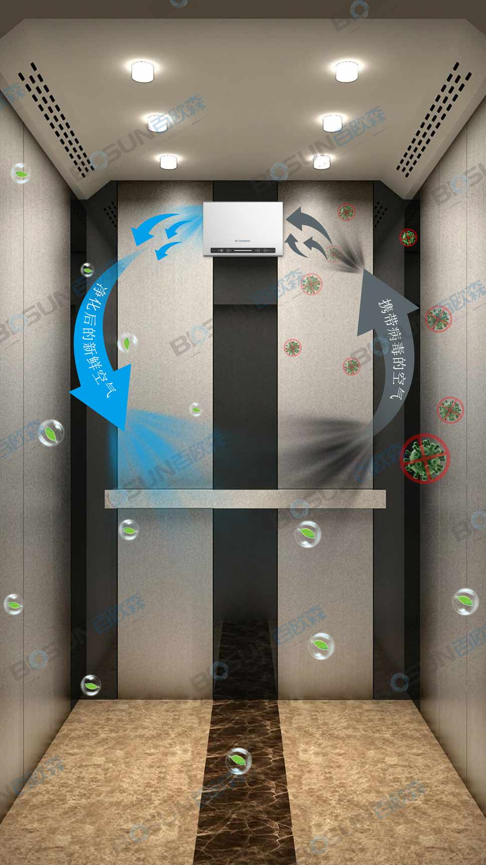 百歐森電梯空氣殺菌凈化系統(tǒng)專門為電梯小空間定制,采用百歐森獨有的“光等離子凈化技術”快速殺滅電梯空間和物體表面的細菌病毒、TVOC等有害物質,同時有效去除異味,為電梯提供優(yōu)質的空氣環(huán)境和疫情防疫措施。