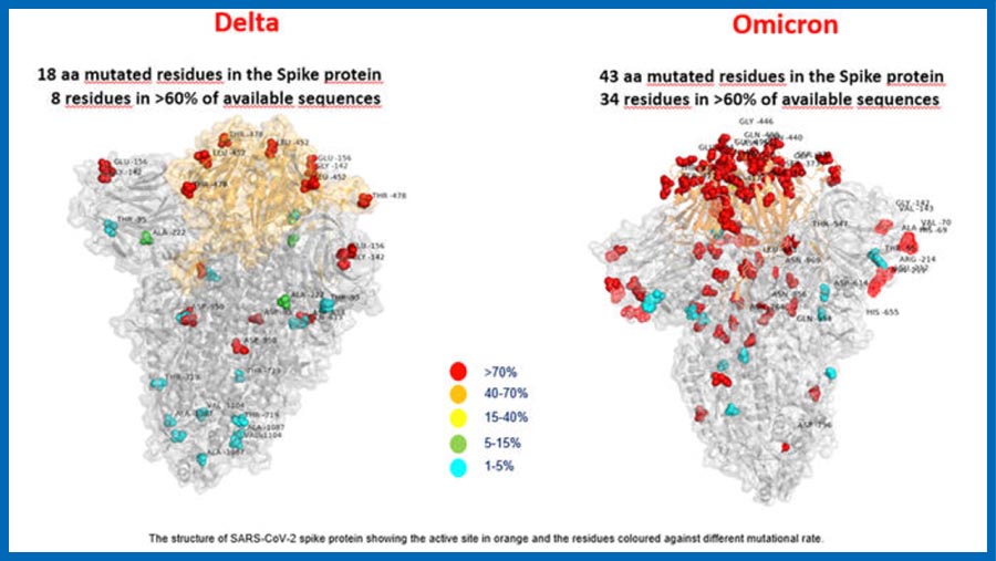 與新冠變異病毒德爾塔毒株相比,奧密克戎毒株擁有更多的刺突蛋白突變。