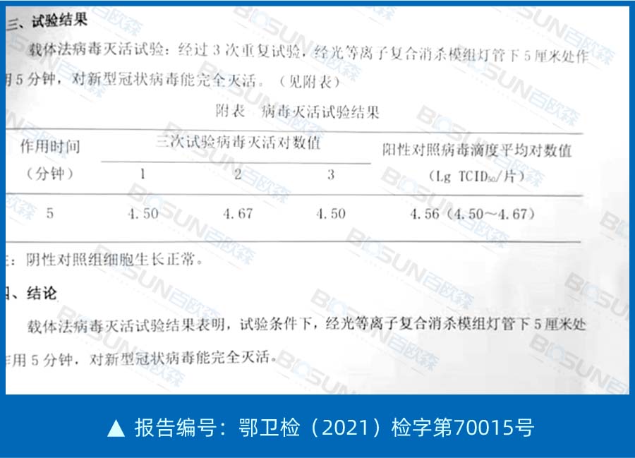 檢測結果:載體法病毒滅活試驗結果表明,試驗條件下,光等離子復合消殺技術對新型冠狀病毒能完全滅活。