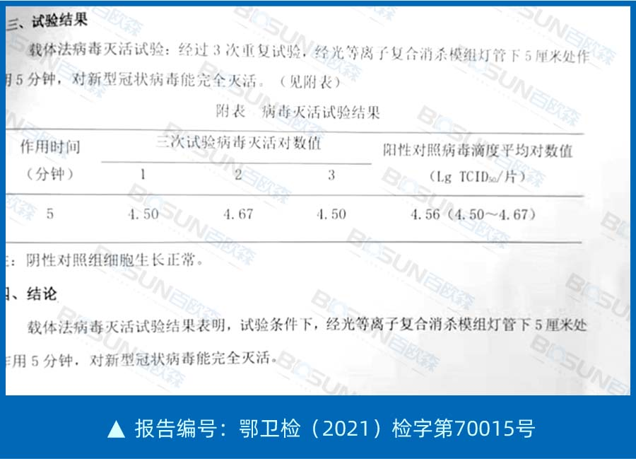 根據國家權威檢測機構—湖北省疾病預防控制中心衛生檢驗檢測研究所測試,百歐森光等離子復合消殺模組對冠狀病毒的滅活率達到了99.99%,有效的證明了百歐森光等離子消毒凈化設備相較其他空氣凈化消殺產品的優越性。